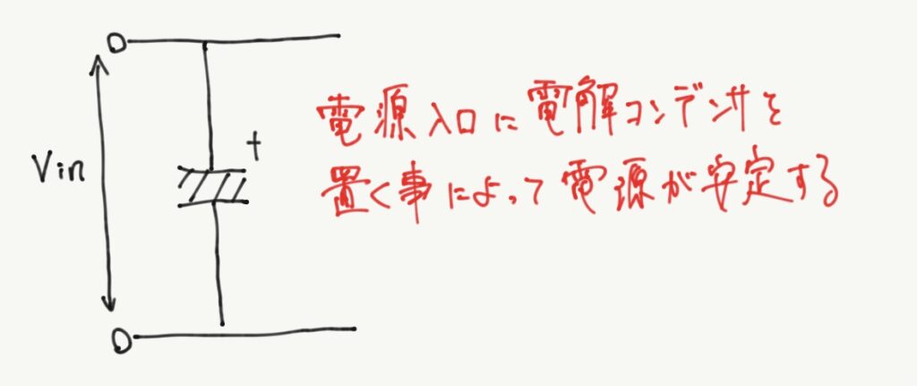 電解コンデンサは、電圧がゆっくり大きく変わろうとしたときに、それを支えるための部品